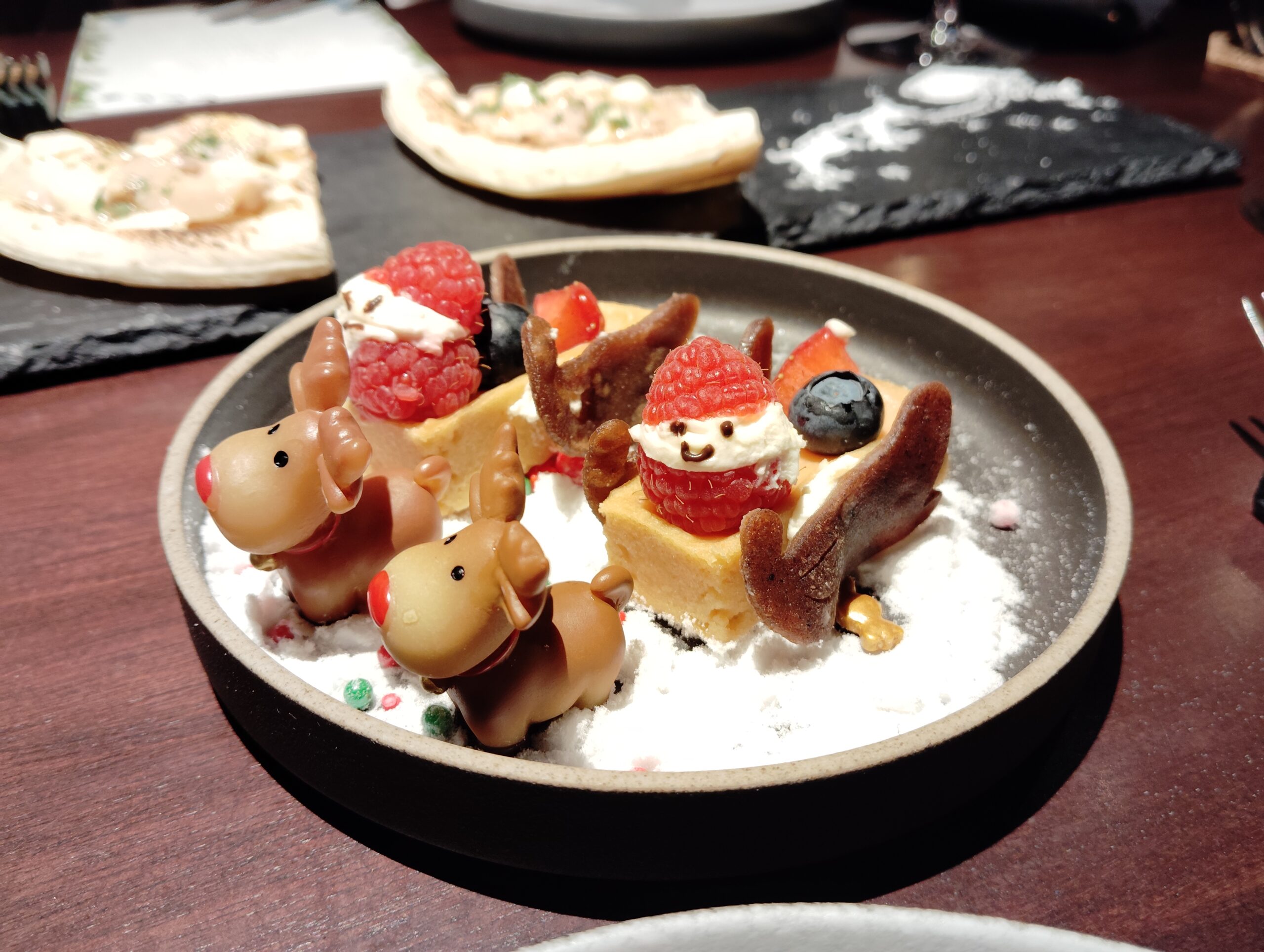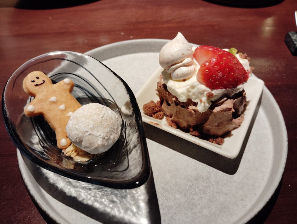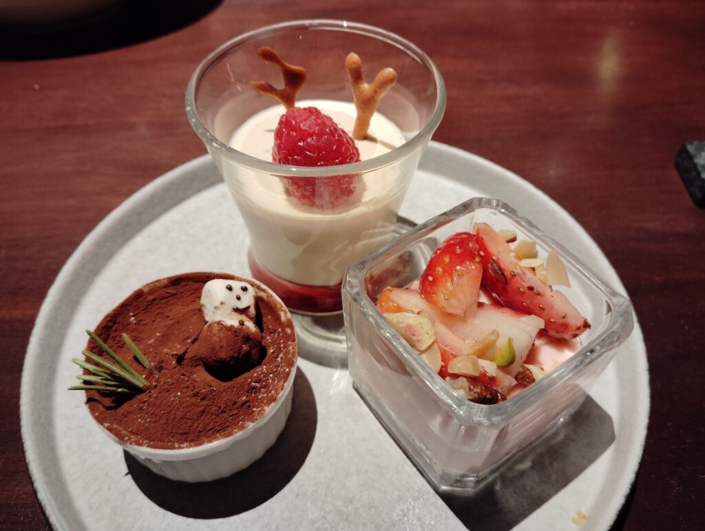 左からスノードームティラミス、紅茶と苺のムース、苺のレアチーズケーキ。トロトロのティラミスがおいしい。雪だるまはマシュマロでできている。