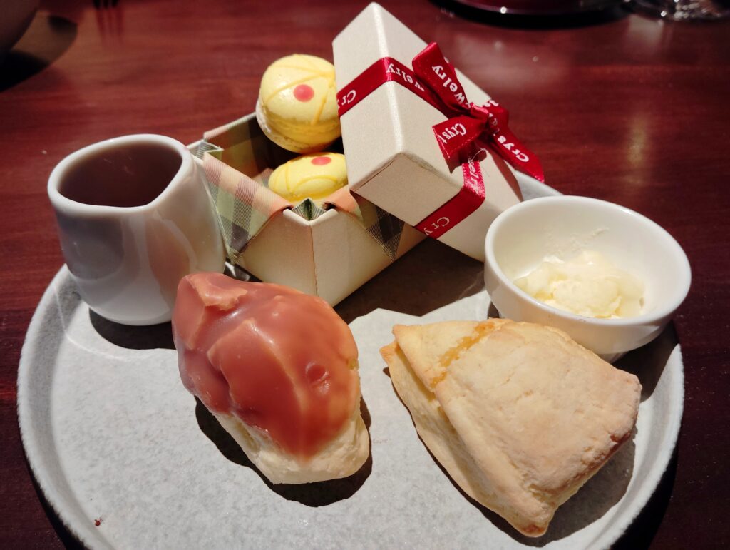マカロン、2種のスコーン。スコーン用に、ヴァンショーのジャムとクロテッドクリーム付き。