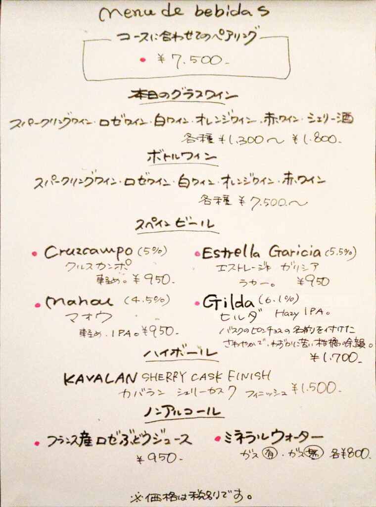 フードはコースのみで、ドリンクメニューは上記のとおり。
