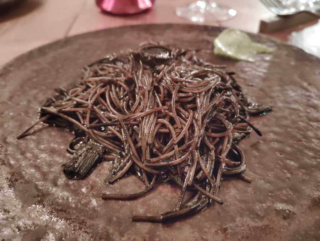 イカスミのフィデウア(米ではなくパスタで作るパエリア)。アイオリソースという、にんにくと卵黄、オイルなどで作るソースを合わせている。