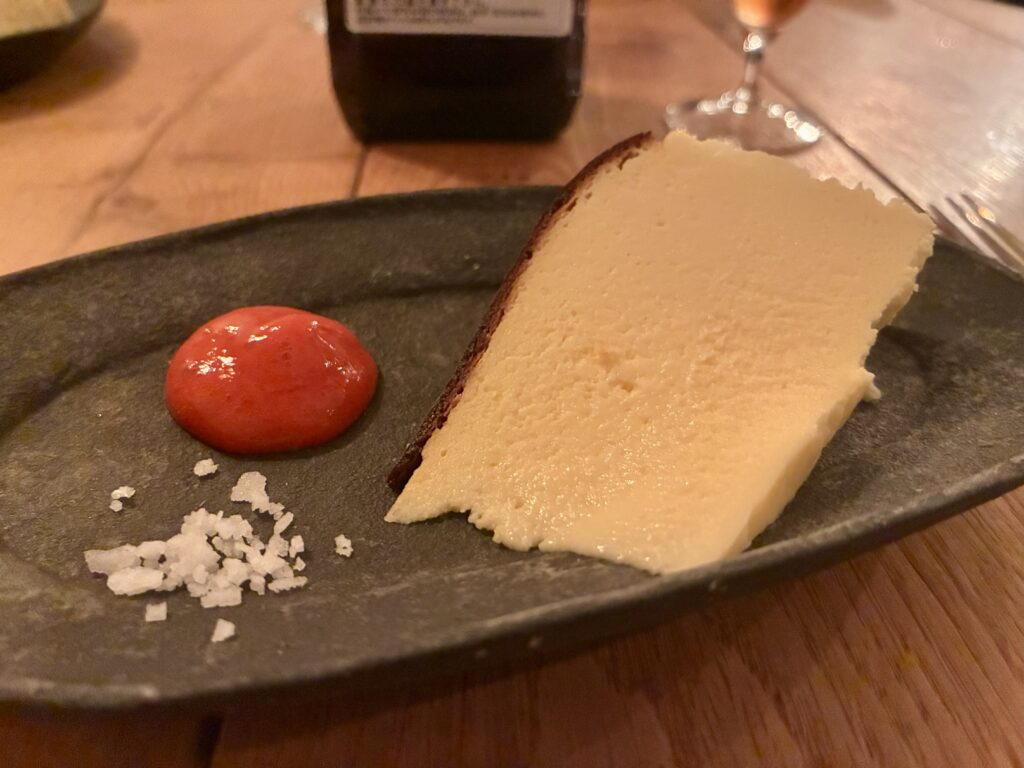 スペイン北部のアストゥリアス地方の、叩いた仔牛の肉でハムとチーズを包んで揚げる料理がカチョポ。それを今回は仔牛ではなくタラの白子でアレンジ。ブルーチーズとキウイが添えてある。