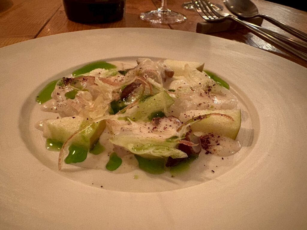北海道産の水ダコ。緑のソースはニラの香りを移したオイル。白いソースはアホブランコという、にんにくとアーモンドを使った冷製スープをソースにアレンジしたもの。刻んだミョウガと青リンゴが添えられている。