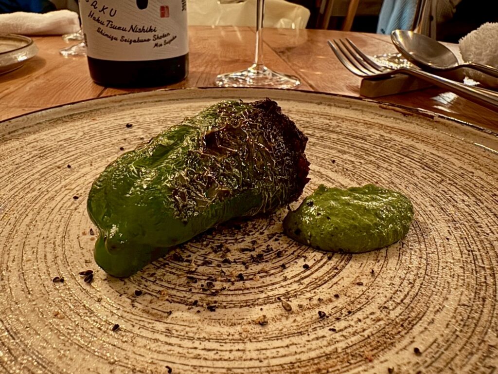 豚肉と豚の血を腸詰めにして作る黒いソーセージがモルシージャだが、それをアレンジ。ピーマンに詰めて炭火で焼いて提供。ソースはモホベルデという、スペインのカナリア諸島に伝わるスパイシーな緑色のソース。