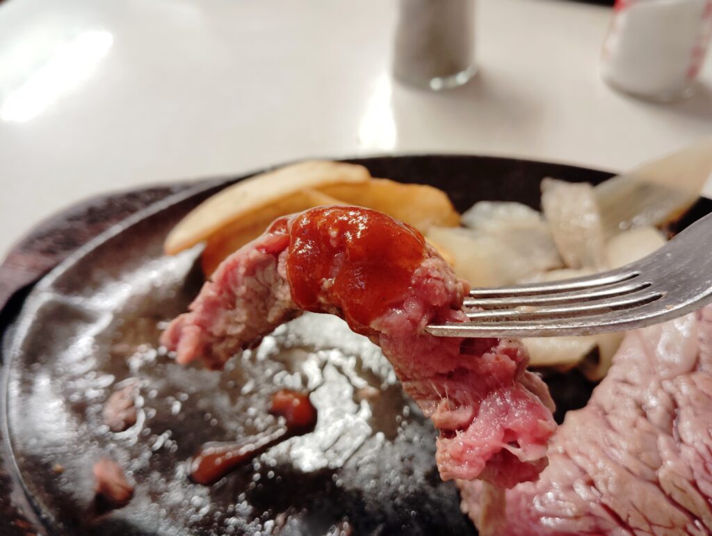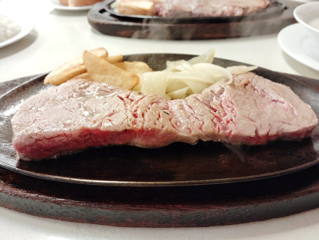 注文してから5分も経たない素晴らしいスピード感でステーキが提供された。今回注文したのは人気No.1の「テンダーローイン ステーキ」。サイズはLサイズで、250グラムある。写真の焼き加減はミディアムレア。ポテト、玉ねぎ付き。