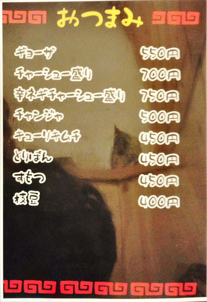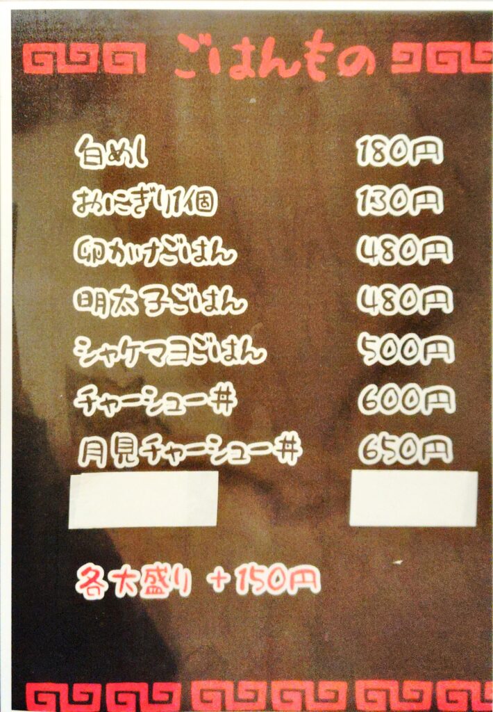 メニューは以下のとおり。ラーメン屋だが、ご飯ものやおつまみ、お酒も充実している。
