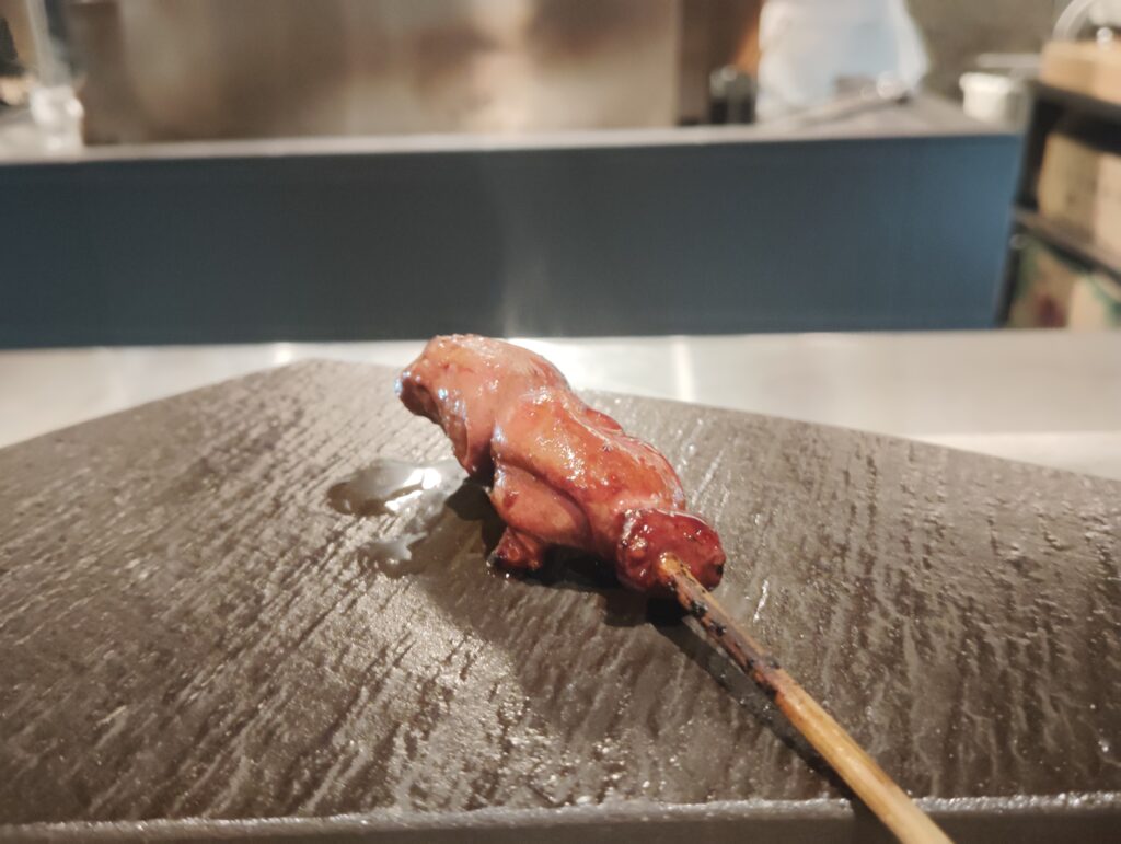 卵の形になる前の卵黄(きんかん)と輸卵管(ひも)を一緒に焼いた希少部位。