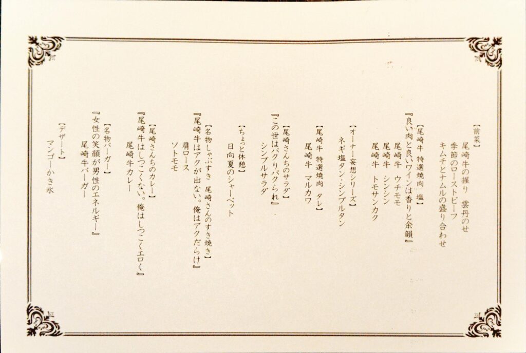 尾崎さんのお宅で行われた伝説のBBQをにくがとう流に再現するというのがコースのテーマ。前菜からバーガーに至るまで、ほとんどのメニューに尾崎牛が使われた贅沢なコース。格言が添えられた遊び心溢れるメニューも楽しい。
