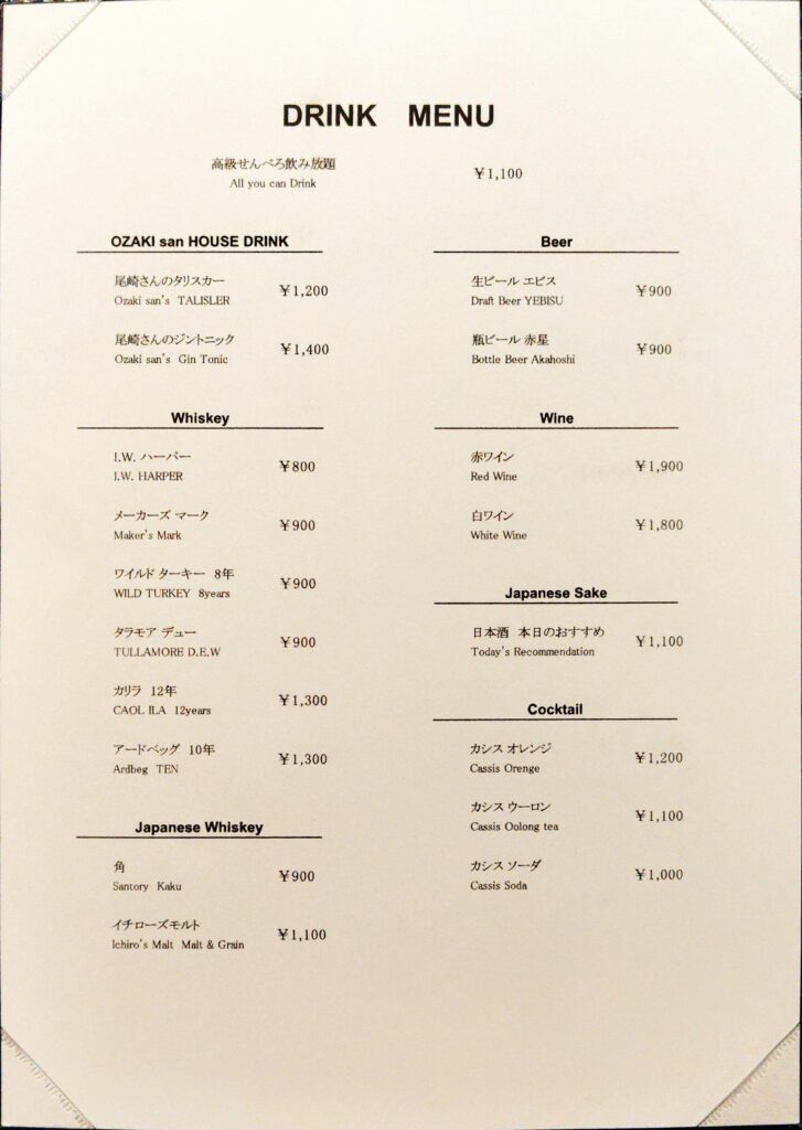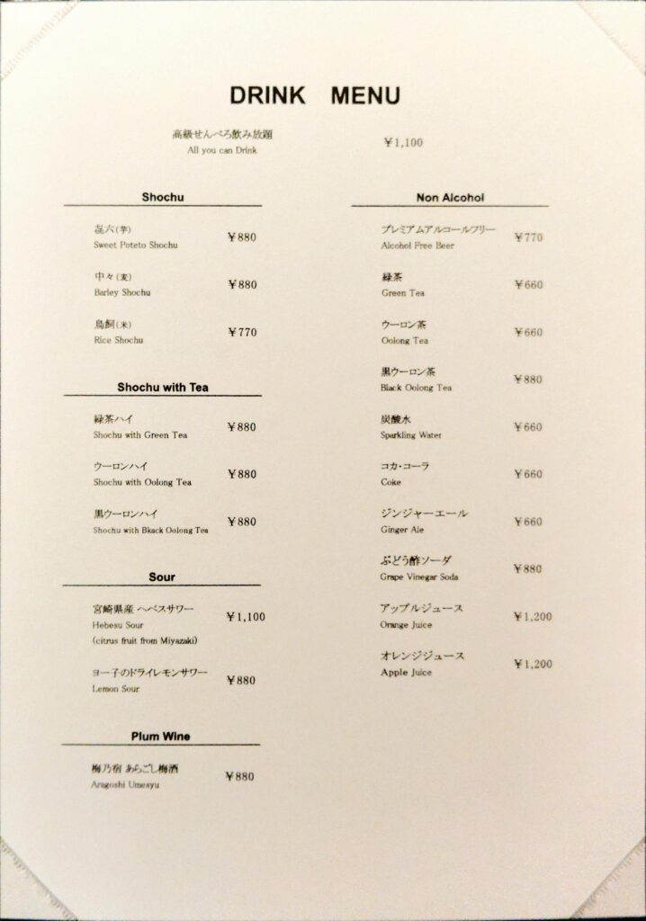 個別注文もできるが、上部に「高級せんべろ飲み放題」とあるとおり、1,100円を支払えば掲載ドリンクが全て飲み放題となる。ドリンクによっては1杯で元が取れる計算となり、頼まない手はない。メニューに記載されていない日本酒も飲み放題に含まれている。このあたりのお得さは、系列の「串あげがとう」などにも通ずるところがある。