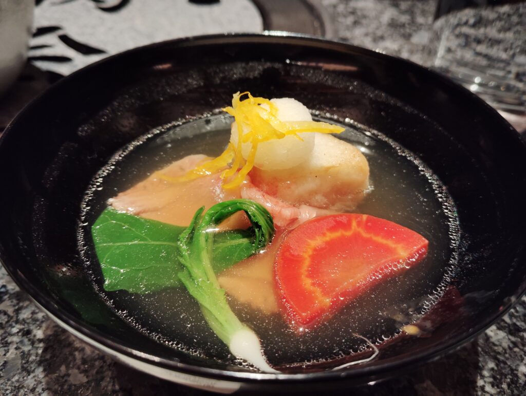 中に入っている大根おろしをお椀に溶いてから食べる。本日の逸品としての位置づけで、夏だと夏野菜を使った冷製のものになるなど、季節によって内容は変わる。