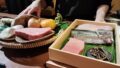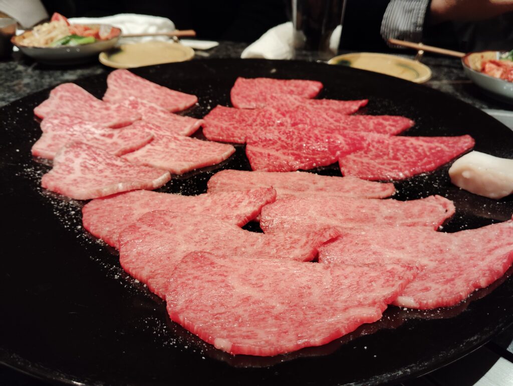まずは本日使うお肉のお披露目。尾崎牛の各部位や上質なタンが目の前にある。見ているだけでうっとりする美しいサシの入り方。この後はコースがスタート。