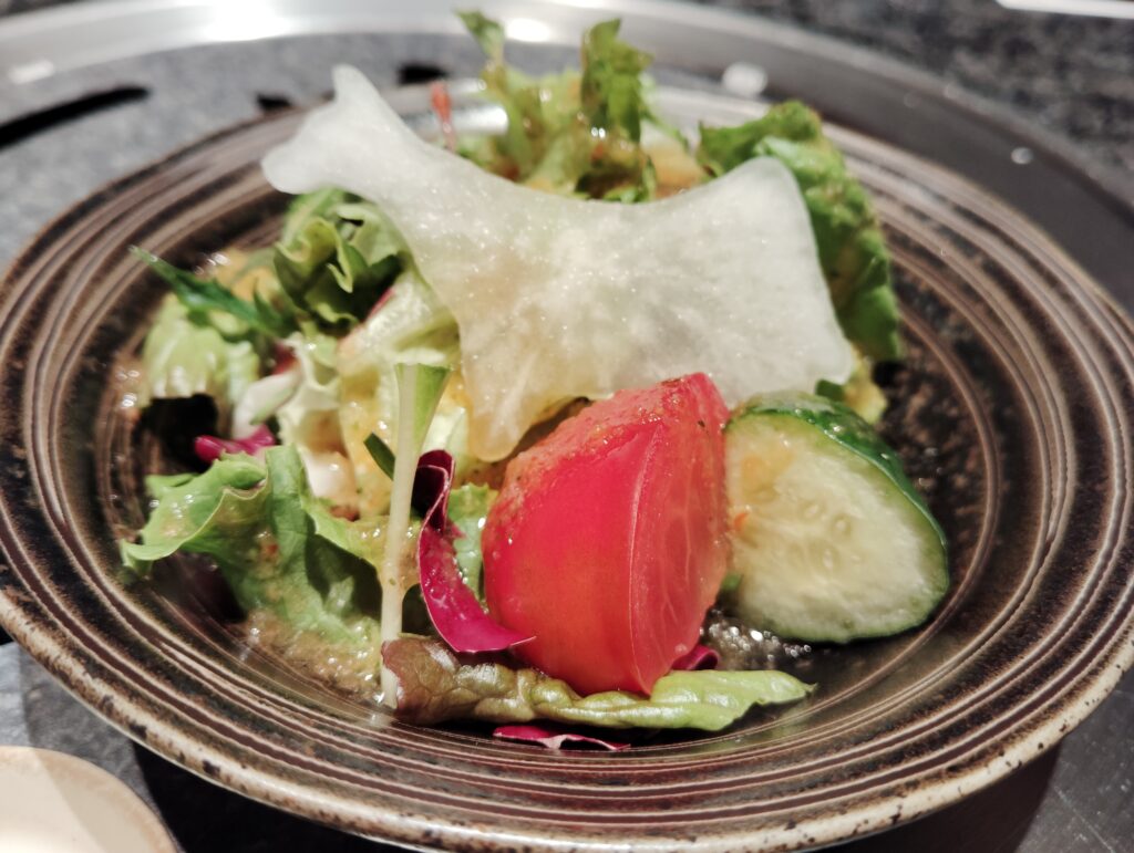 淡路島産の糖度が高い玉ねぎを使用した自家製ドレッシングがおいしい。大根は牛の飾り切り。