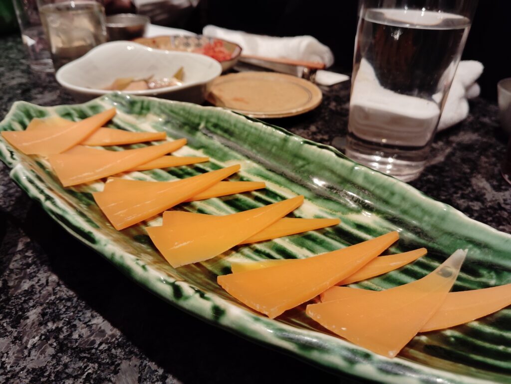 早速とんでもない料理が登場。大きめカットの尾崎牛の握りの上に雲丹が乗っている。味はついているのでそのまま食べられる。シソの香りと雲丹の甘みが尾崎牛に華を添える。