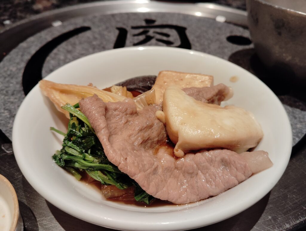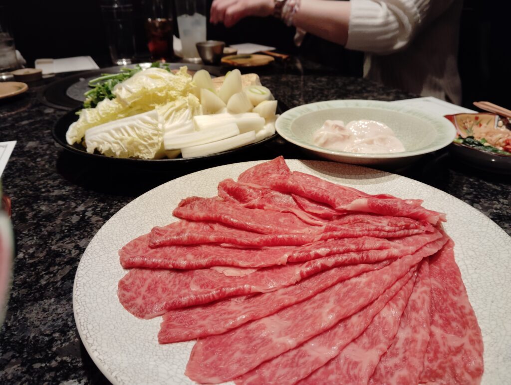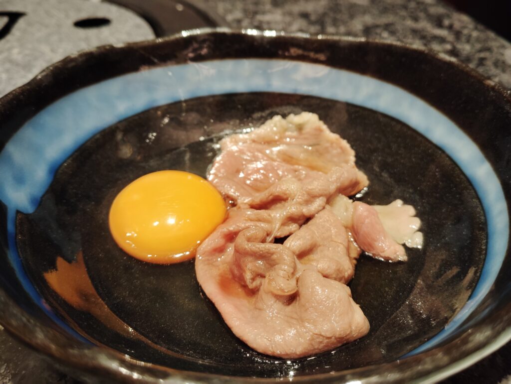 「尾崎牛はアクが出ない。俺はアクだらけ」という名言?を残したとされる尾崎さん。実際、アクは出ておらず、さっぱりとおいしく食べられる。部位は肩ロースとソトモモで、すき焼きにはフグの白子も使っている。