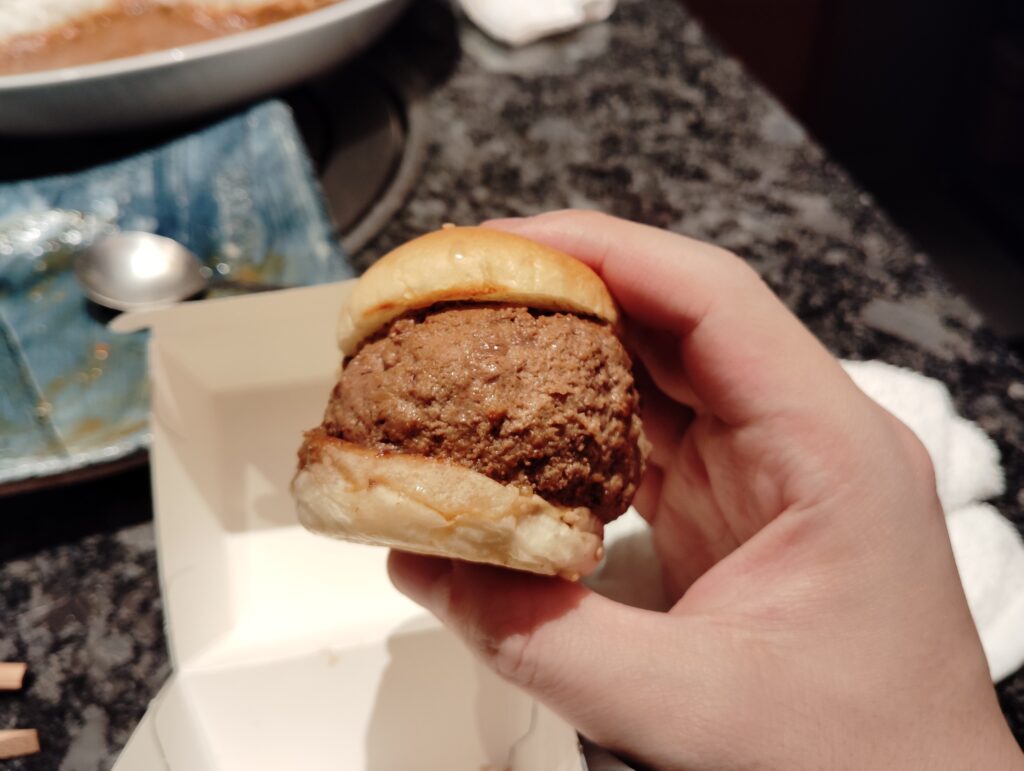 にくがとう名物のハンバーガーも尾崎牛を100%使用。パテを噛み締めると信じられないほどの量の肉汁がじゅわっと溢れる。しかもご覧のとおりの分厚さ。なんとバンズよりも厚い。