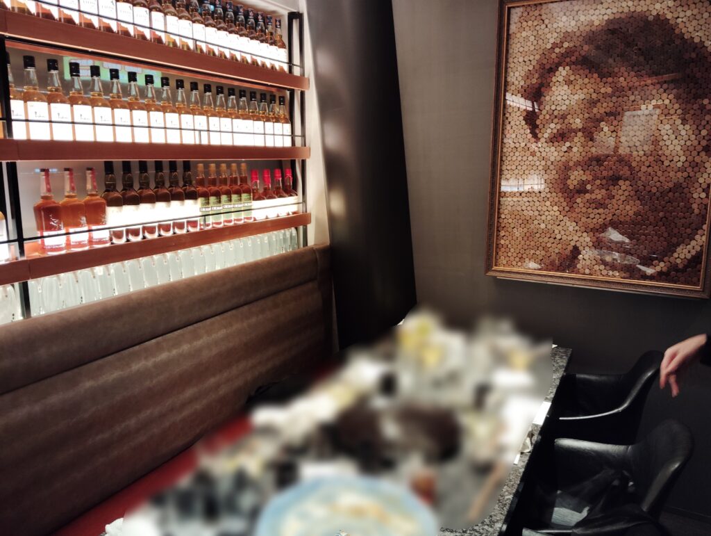 壁にずらりと並んだボトル、コルクで作った尾崎さんの肖像画、その他語録集なども置いてあり、遊び心溢れる隠れ家といった雰囲気。