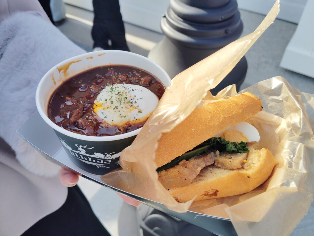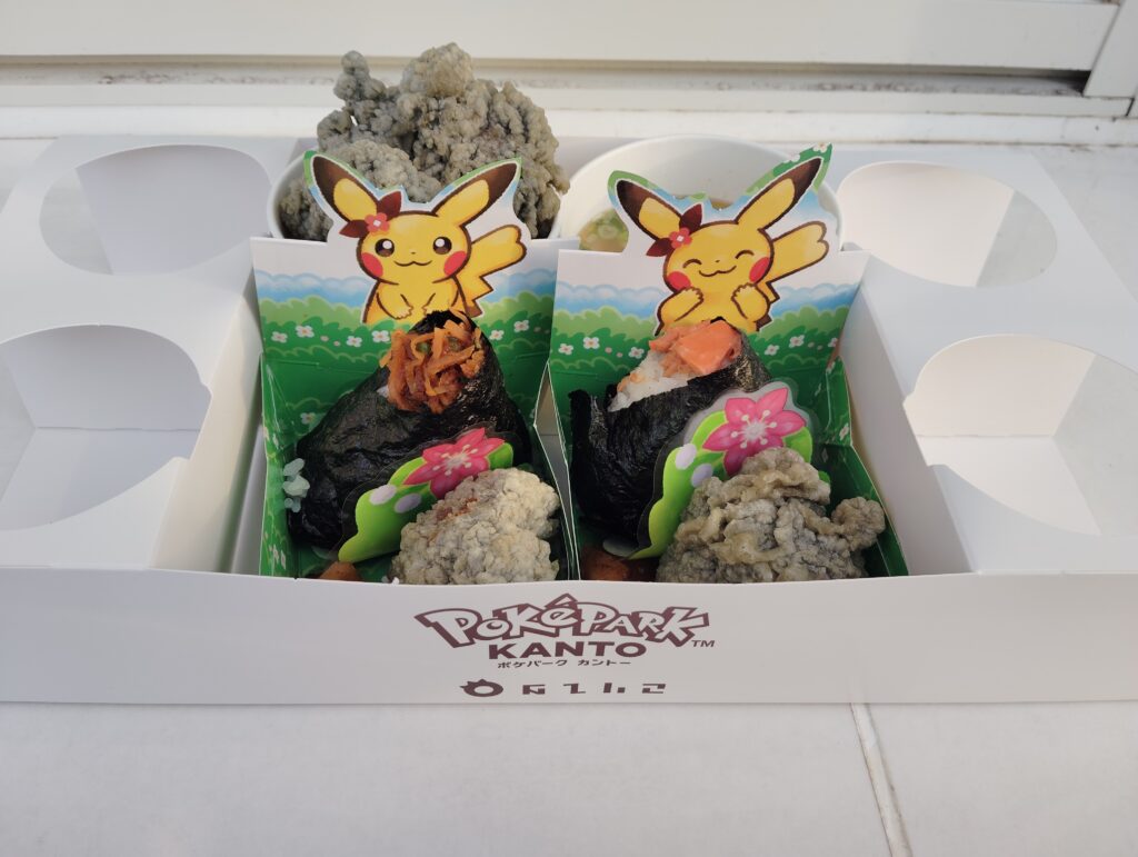しっかりとした食事が欲しい人には、「ピカチュウのおにぎりや」がおすすめ。ここでは、4種類のおにぎり、黒い見た目が強烈なインパクトを放つ「竹炭からあげ」、具だくさんのとん汁を味わうことができる。からあげはひとつひとつがしっかり大きくて食べ応え十分。おにぎりのトレーもランダムなオリジナルデザインで、食べ終わった後に捨てるのがもったいない。