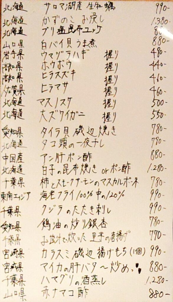 高級寿司というと、コース1本のお店が多いが、「sushi AKEBONO」では、アラカルトも用意されている。一般的な握りに加え、店内におつまみのメニューが掲示されている。