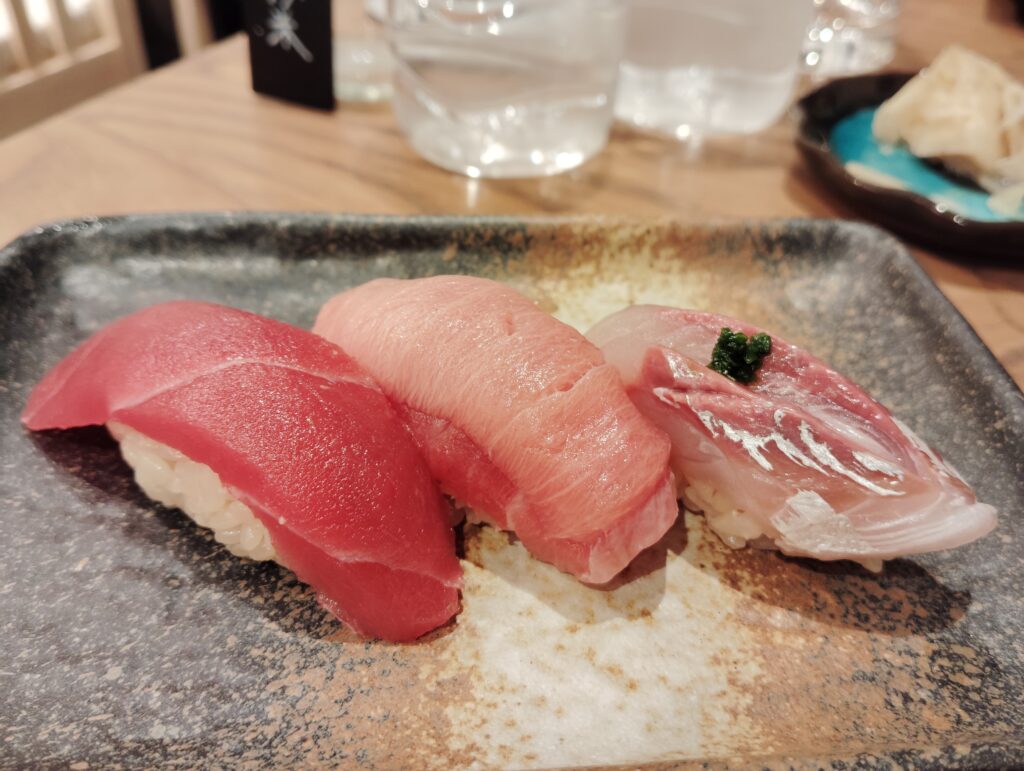 本マグロの赤身と中トロ、真鯵の3貫盛り。中トロのとろけるような脂がたまらない。シャリに使っている酢は3種類をブレンドしているとのこと。