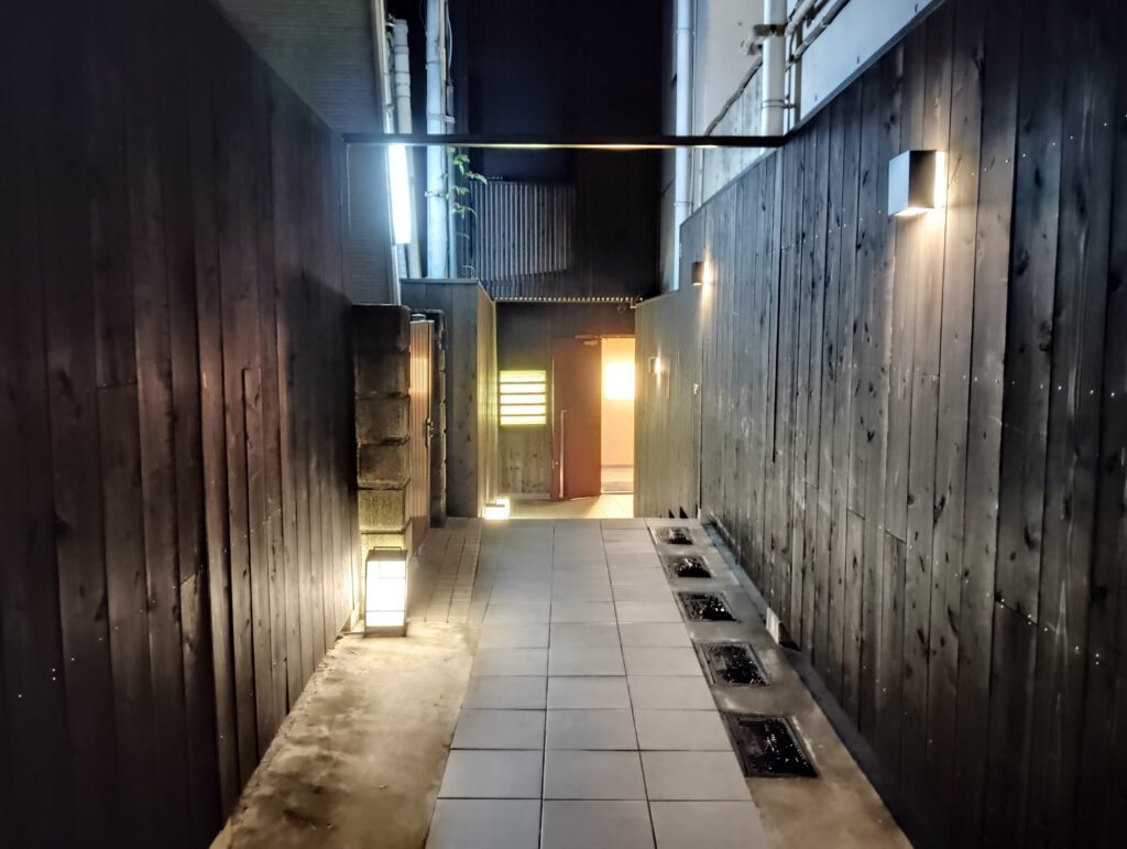 場所はややわかりにくい。写真中央の光る看板脇に細い通路があるので、そこを奥に進むと見つかる。