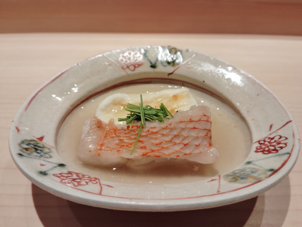 北海道根室産のキンキ。骨の出汁で火入れしている。奥にあるのは自家製の焼き落花生豆腐。生姜を足した魚の出汁を薄い餡にして上からかけ、ゆずと芽葱をトッピング。1品目から圧倒的なおいしさ。