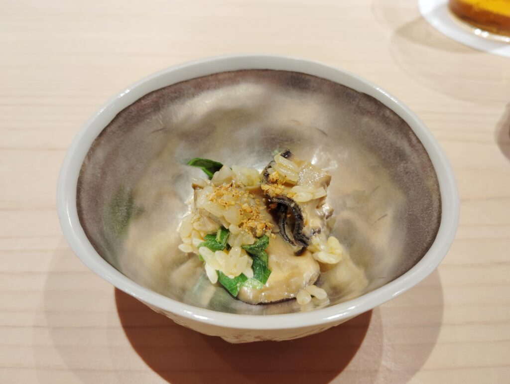 三陸産の牡蠣。お酒、醤油、自家製の葱油でオイル煮にして、1日置いている。ダイス状にカットし、シャリと大葉を混ぜた後、最後にごまをかけている。