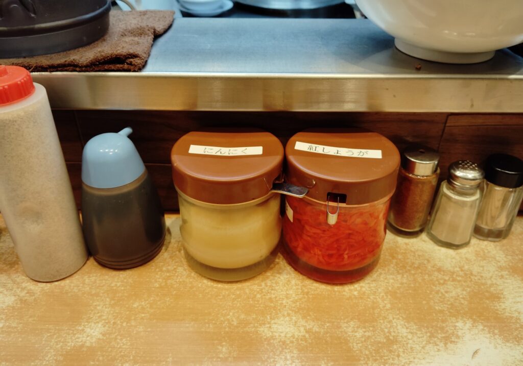 卓上には紅しょうがやにんにくなどの調味料が置いてある。