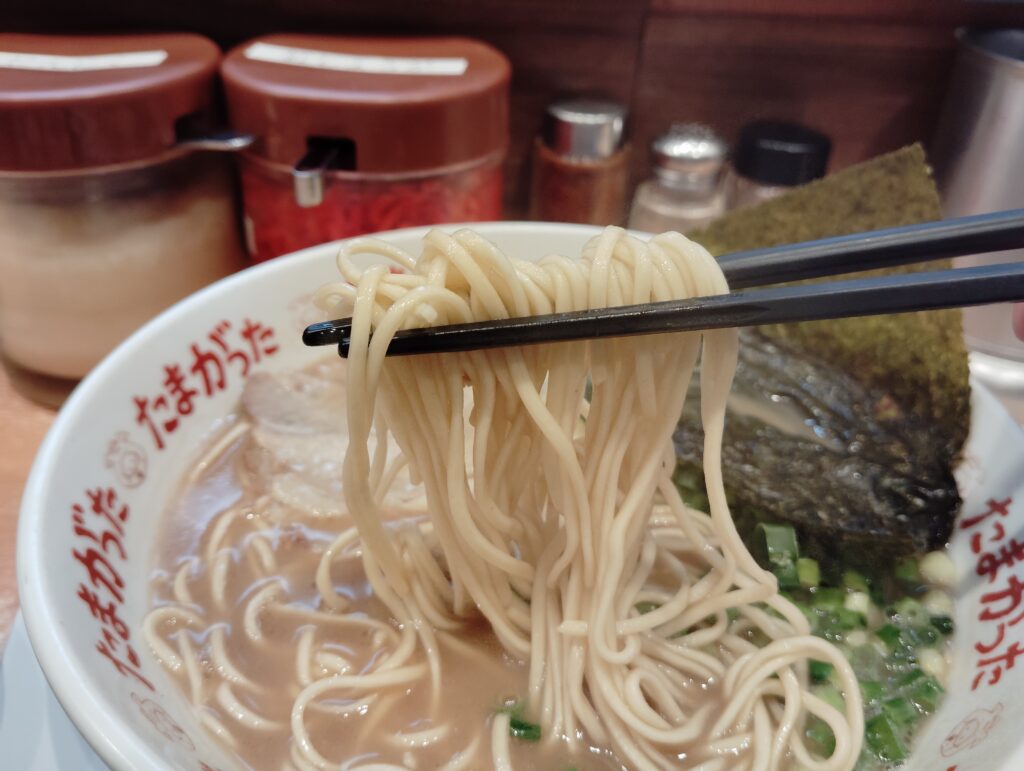 麺はストレートの細麺。茹で加減は「ばりかた」にしたが、博多などにもよくあるように、「はりがね」や「かため」など複数の茹で方から選べる。店内掲示によれば「ばりかた」の茹で時間は約7秒。イメージを裏切らないパツパツ感のある麺で、わしわしと食べる、その歯ごたえが心地良い。