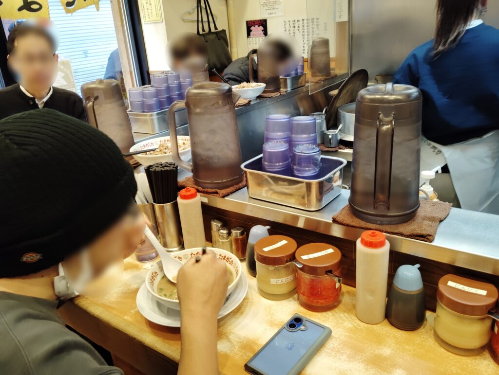 食券を購入した後、待ちがなかったのでそのまま入店。お店の人に食券を渡し、席に座る。このタイミングで麺の固さを指定。今回は「ばりかた」にした。