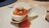 先付けはワタリガニ。お出汁とお酢のジュレがかかっているので、崩して一緒に食べる。しその香りも良いアクセント。